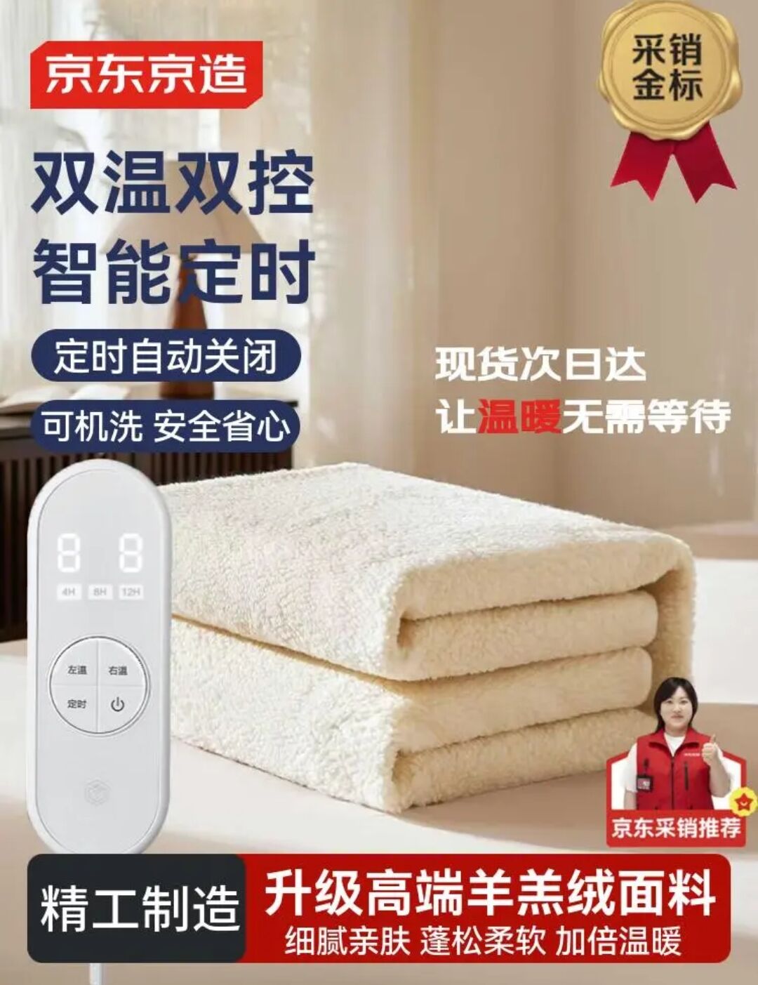 京东京造TOP星定时电热毯【高端羊羔绒】家用电褥子3C认证-双人双控1.8x2m